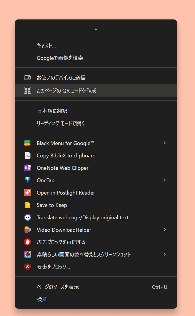 私のChromeはいろいろ拡張機能を入れているので、それ関連のメニューが大量にあってわかりづらいですが。